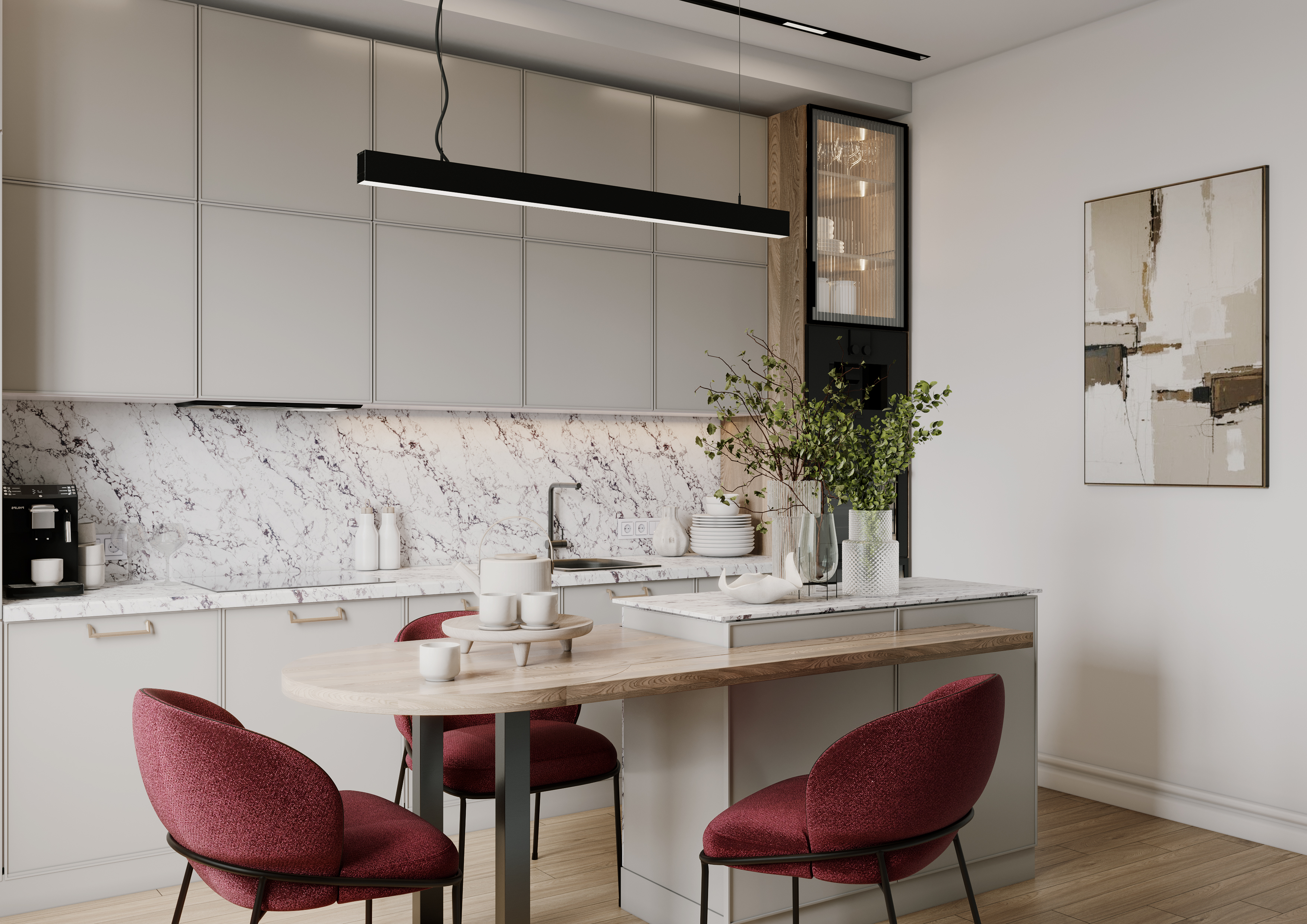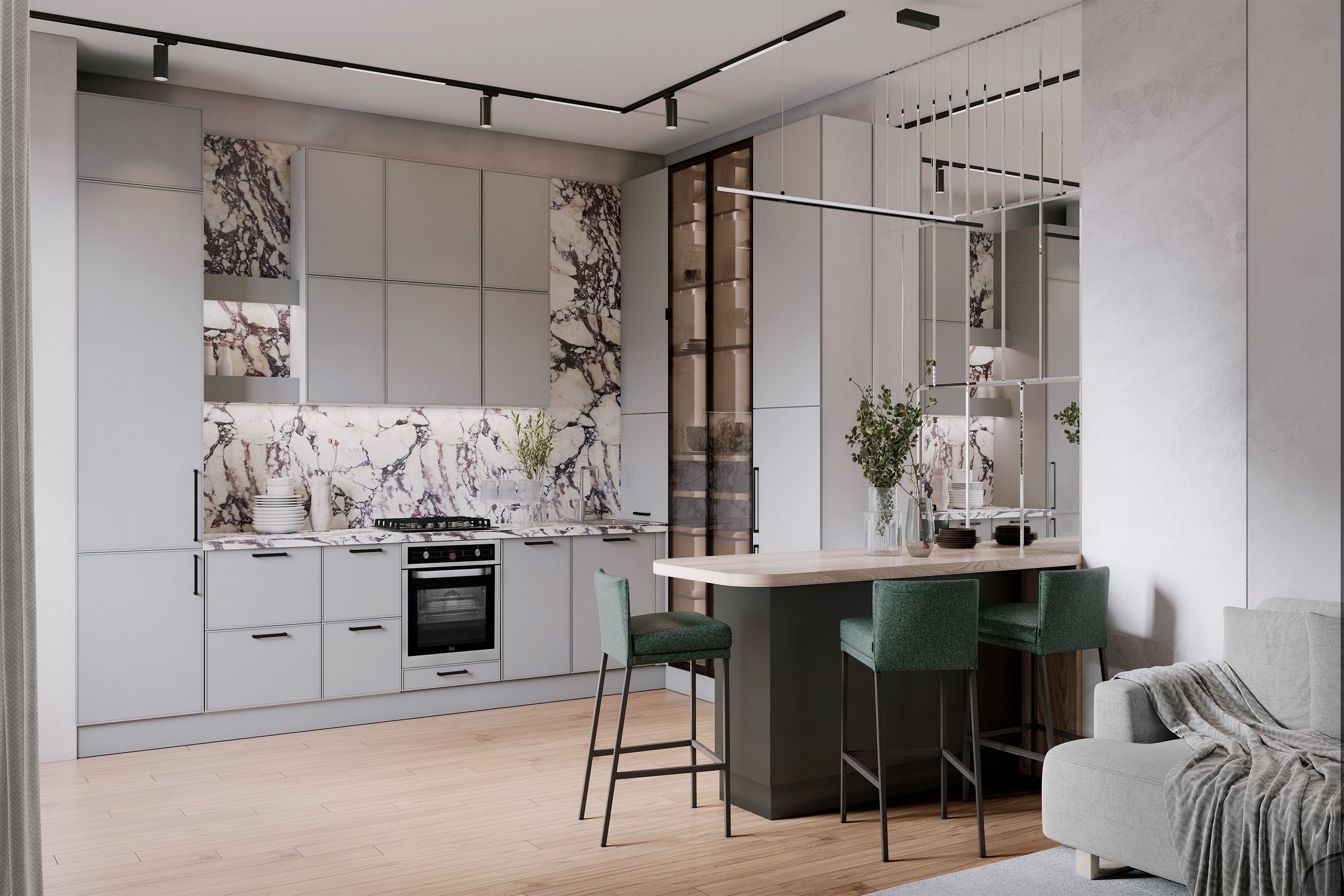 Кухня ЛАЙН ЭМАЛЬ — модель с фрезерованным рамочным фасадом в новом прочтении: вместо традиционной широкой рамки фасадыФасад — лицевая часть мебели: распашная или подъемная дверца на секции, наружный элемент выдвижного ящика.Подробнее имеют изящную узкую окантовку по периметру. Это позволяет визуально выделить границы секций и задать ритм интерьеру. Модель предполагает возможность сочетания монохромных покрытий с акцентными текстурными материалами, например, под деревоДерево: натуральное дерево или рисунок, имитирующий деревянную поверхность. Подробнее. Выраженная геометрия металлических стеллажей и блеск стекла в алюминиевой рамке подчеркнут современный стильСовременный: минималистичные фасады, простые формы, актуальная цветовая гамма, возможность нестандартных композиций. Подробнее кухни.