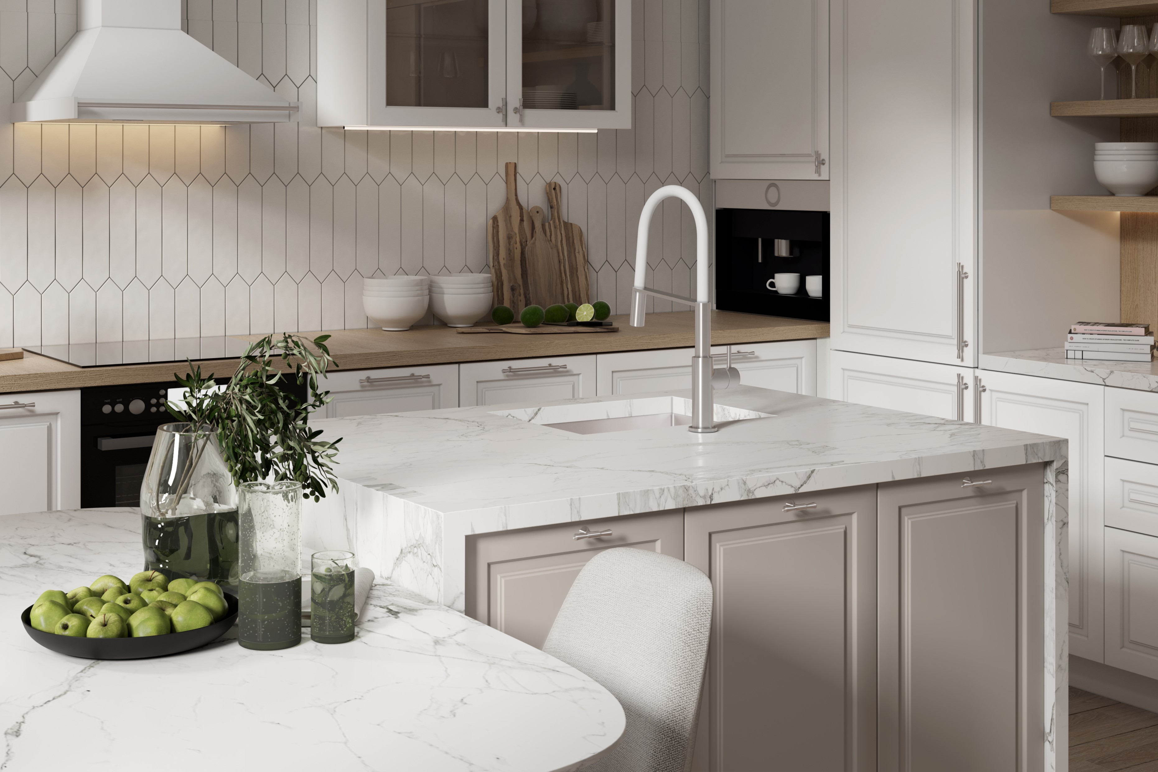 Столешницу и стеновые панели для кухни НОРД рекомендуем выбирать с рисунком, имитирующим натуральный камень. Помимо 30+ вариантов ламинированных влагостойких столешниц, которые имеются в ассортименте фабрики, мы можем изготовить для вашей кухни особую столешницу из искусственного камня, кварцевого агломерата или крупноформатной керамики.