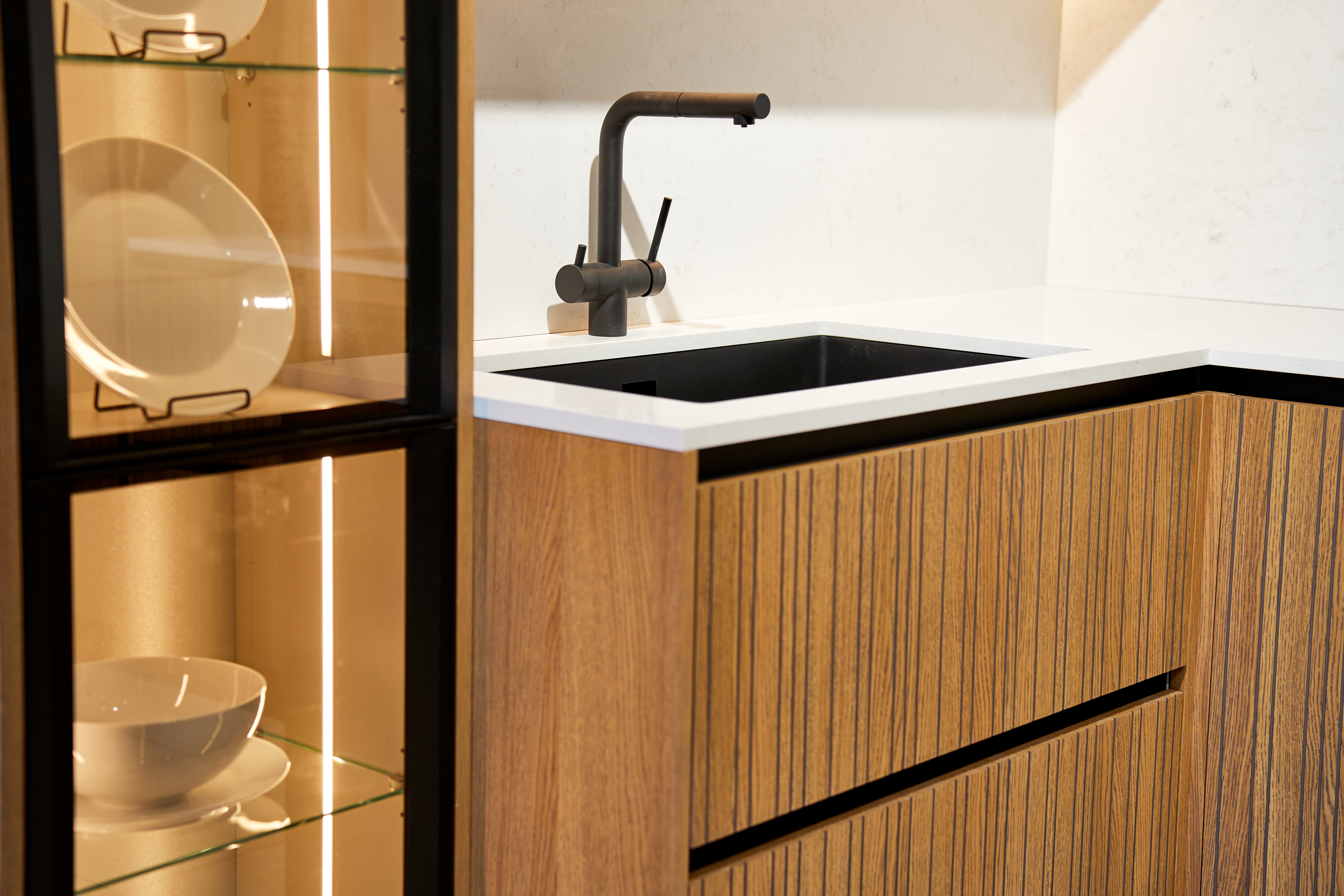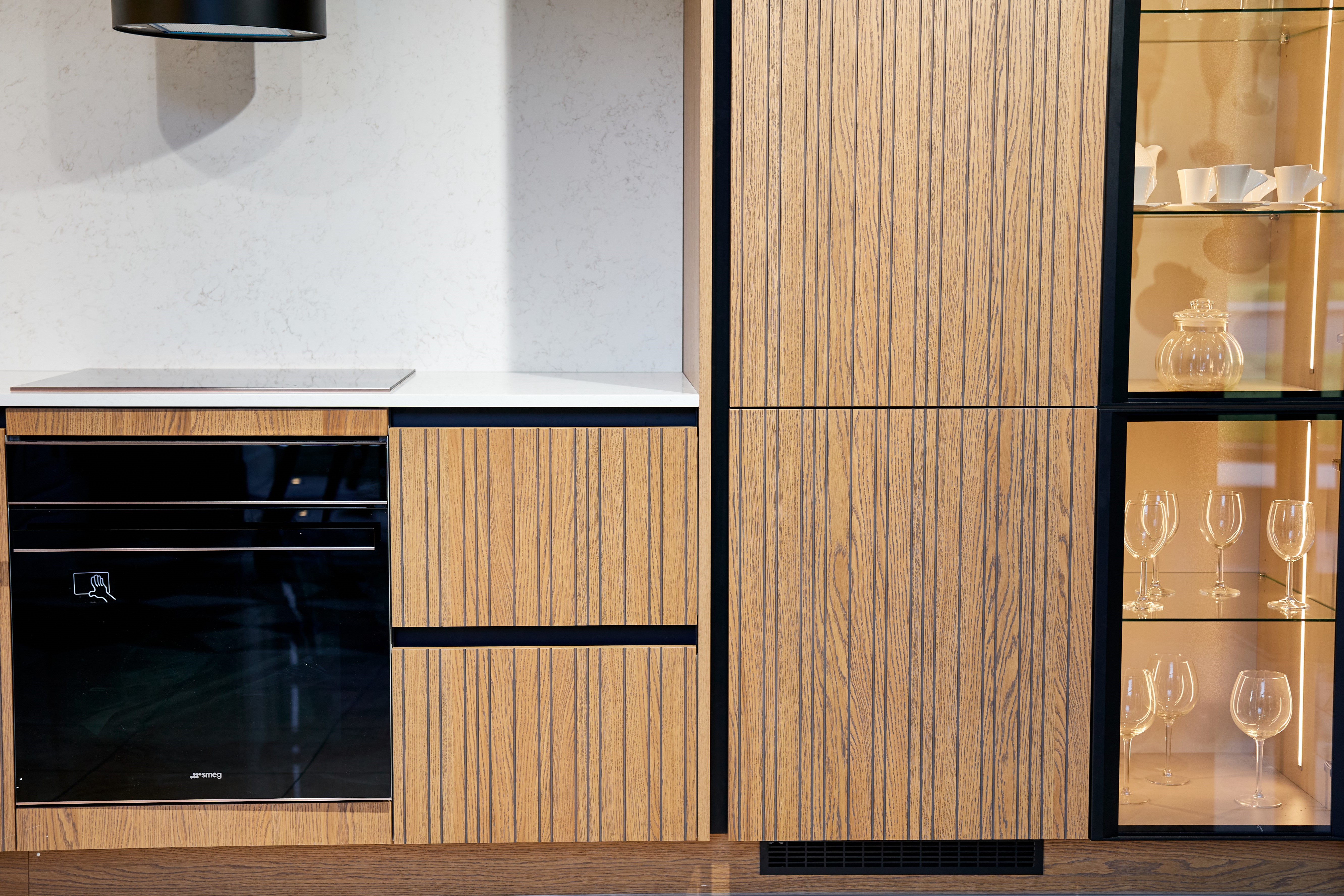 Кухня РИТМО — премиальная модель, созданная специально для современных интерьеров, в которых мебель интегрируется в пространство. Фасады кухни РИТМО облицовываются натуральным древесным шпономШпон: отделочный материал естественного цвета с деревянной структурой поверхности — тонкие листы природной древесины, срезанные с массива дерева. Обладает уникальным рисунком. Подробнее. Графичные полоски на поверхности создаются методом фрезеровки и покрываются коричневой патиной в тон шпону. Активная фактура фасадов РИТМО превосходно комбинируется с однотонными прямыми фасадами в «припыленных» цветах. Продуманная подсветка подчеркнет геометрию модели.