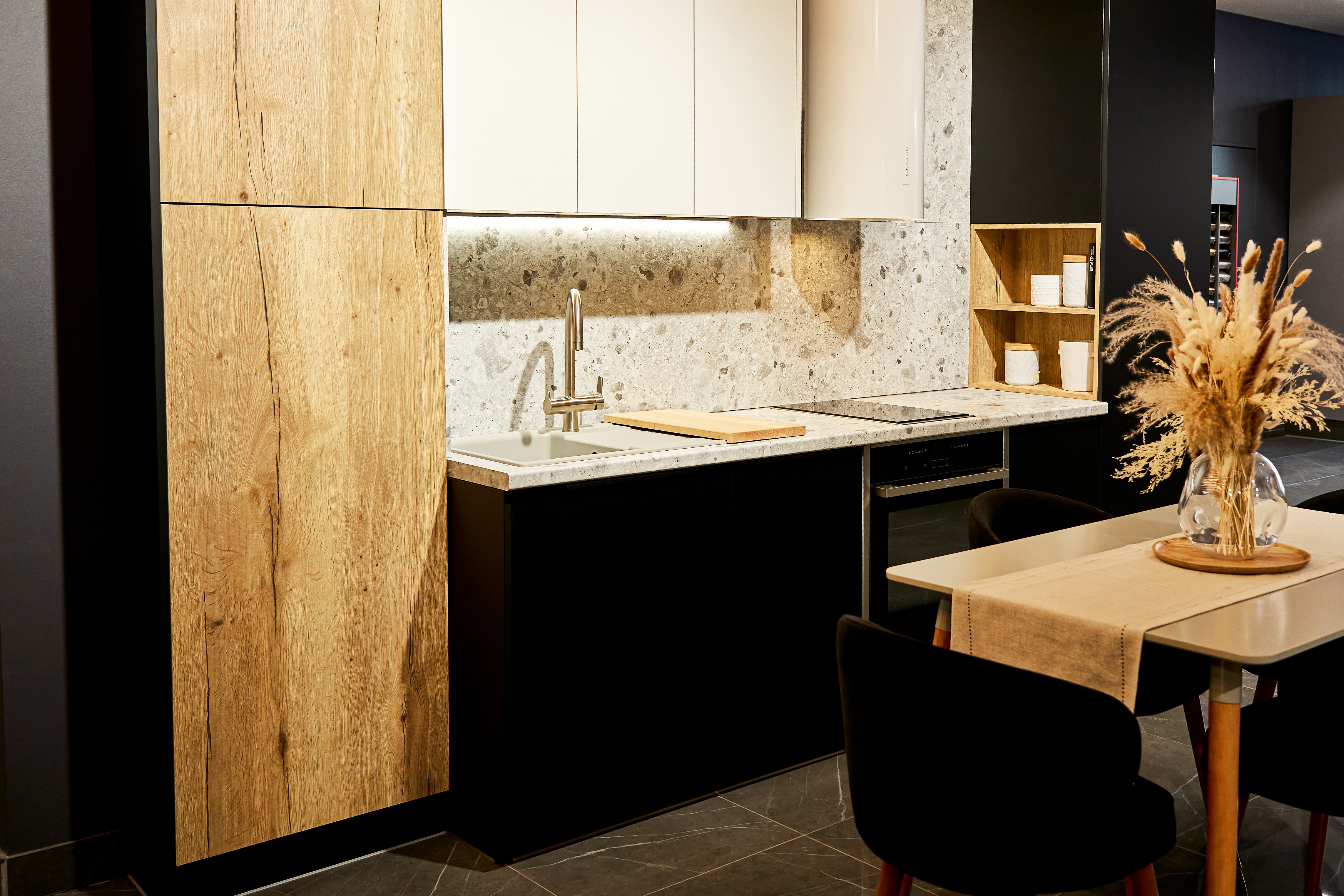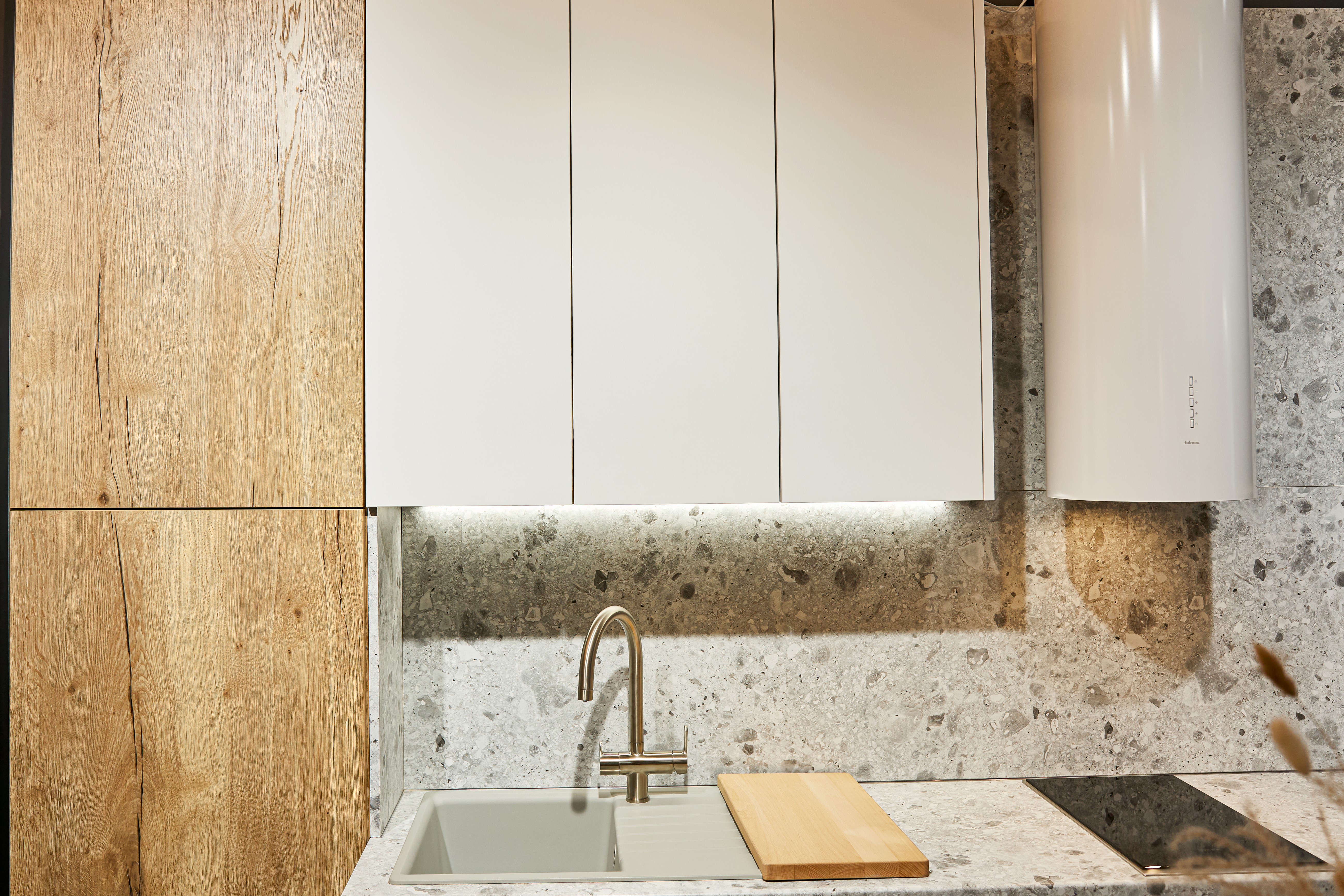 Бытовая техника, мойки и смесители, столешницы и стеновые панели, системы хранения — закажите вместе с кухней.