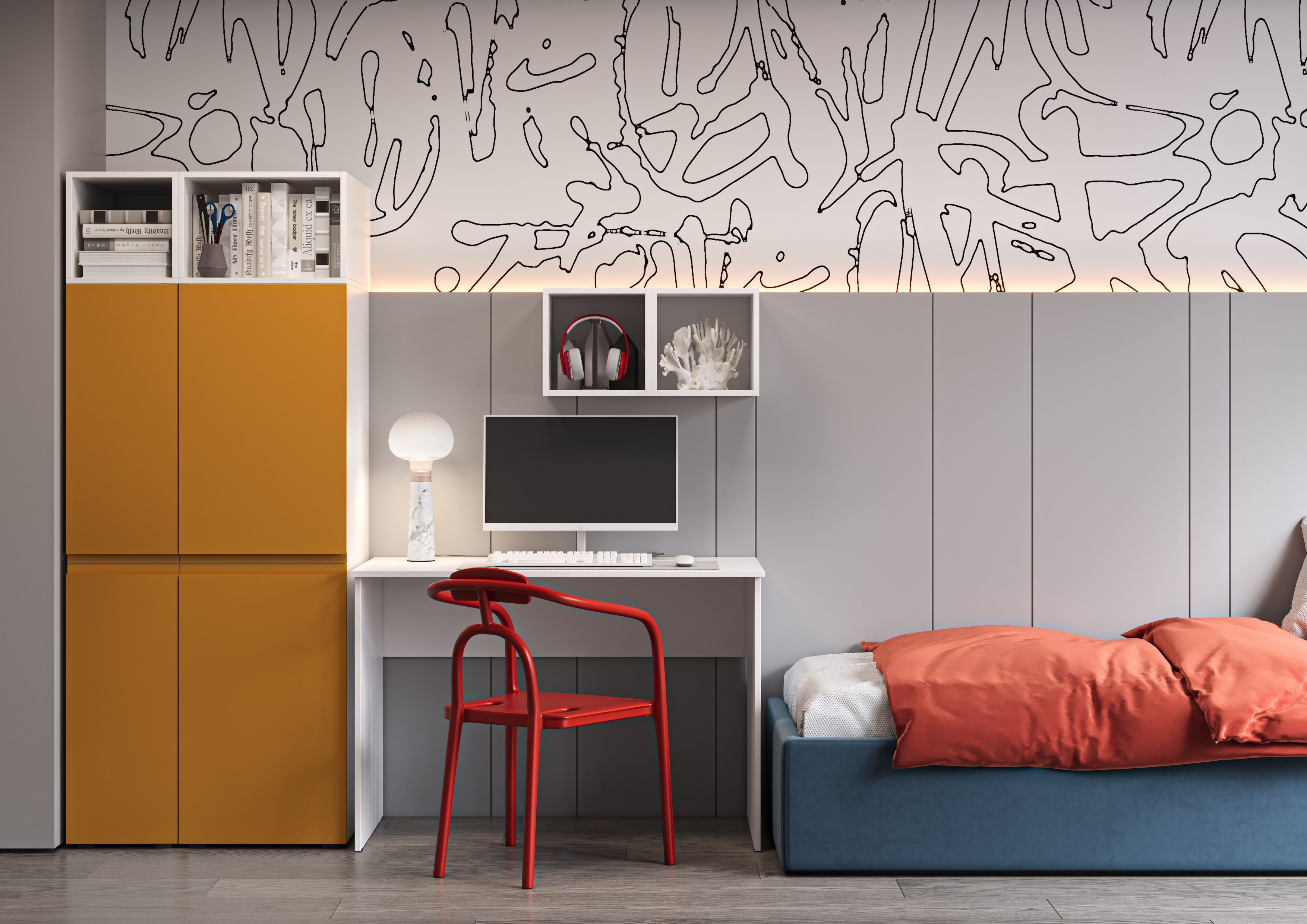 Комплект мебели для детской включает прикроватную тумбу с нишей и большую напольную тумбу, состоящую из отделения с распашной дверью и открытого стеллажа, с общим топом.