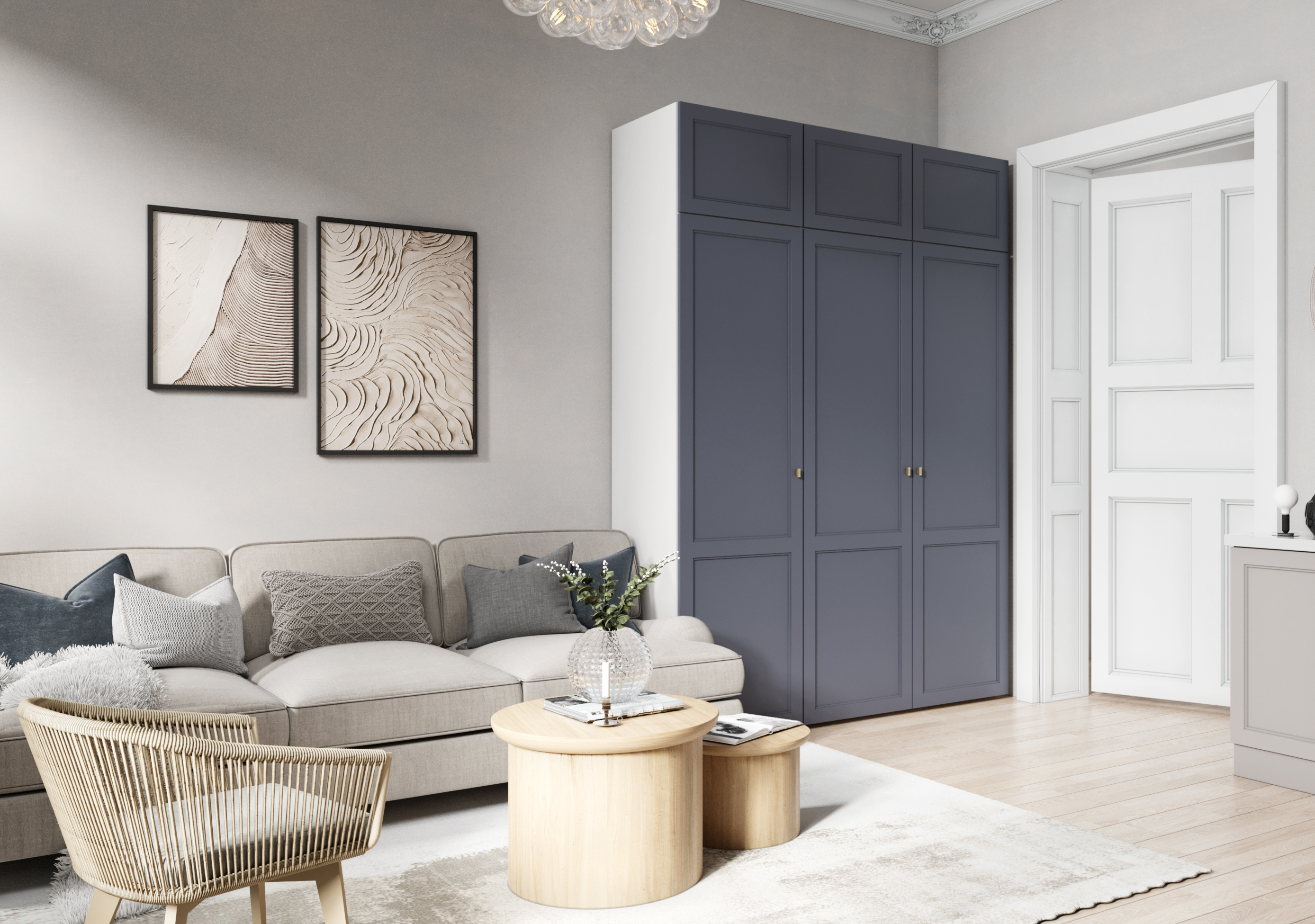 Комплект мебели для гостиной включает подвесную тумбу для ТВ с двумя откидными фасадами и топом.