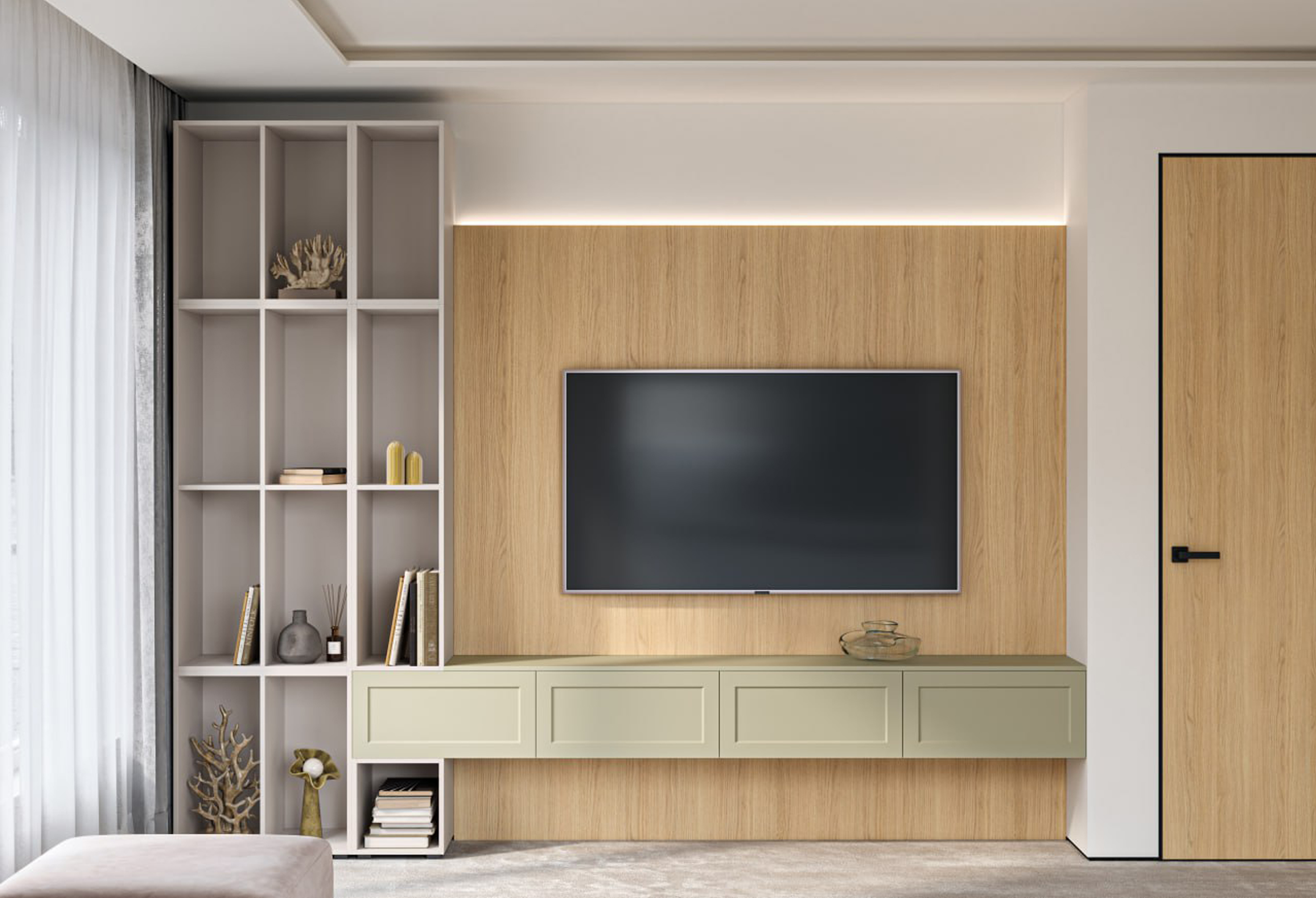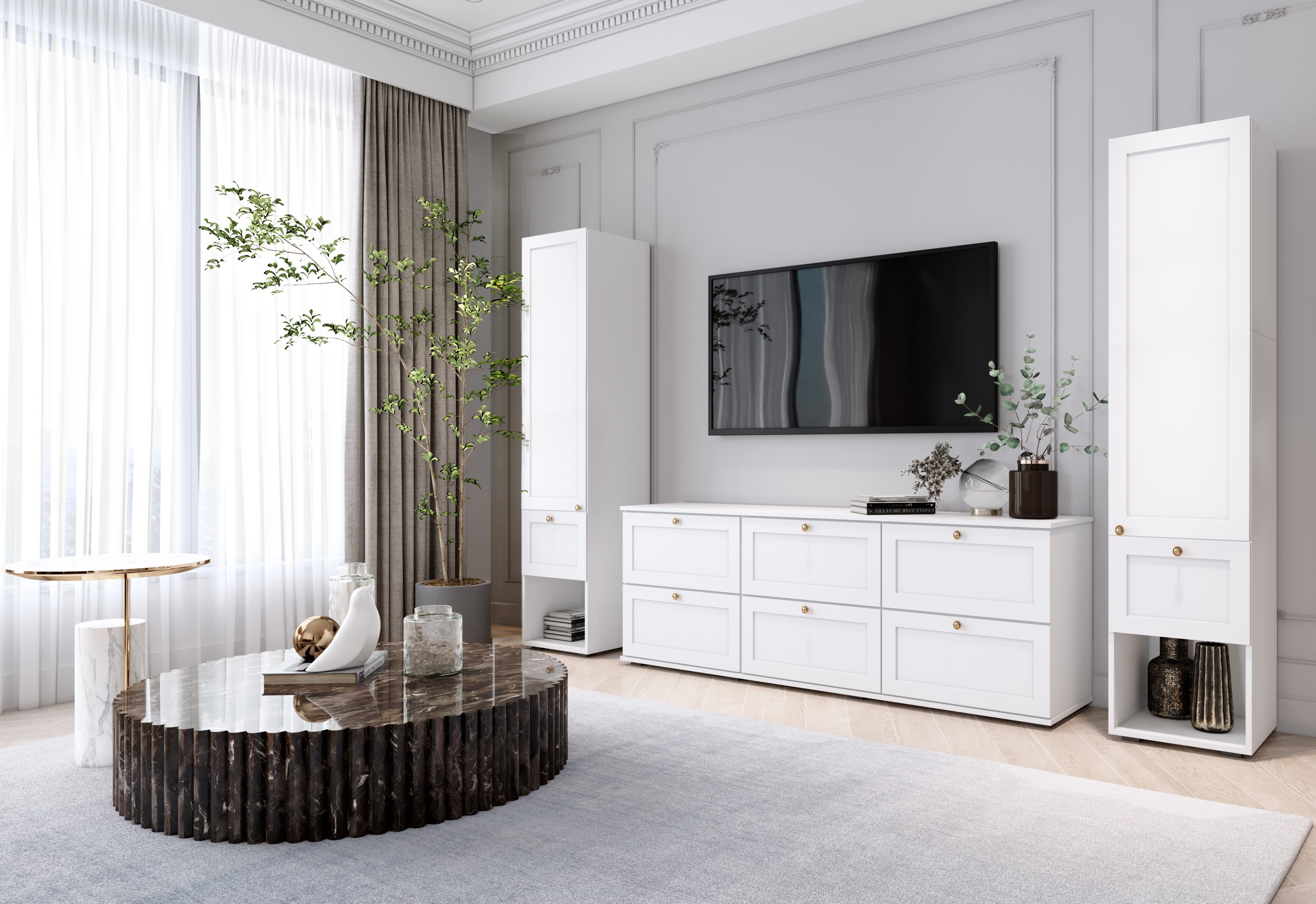 Комплект мебели для гостиной включает подвесную тумбу для ТВ с двумя откидными фасадами и топом.