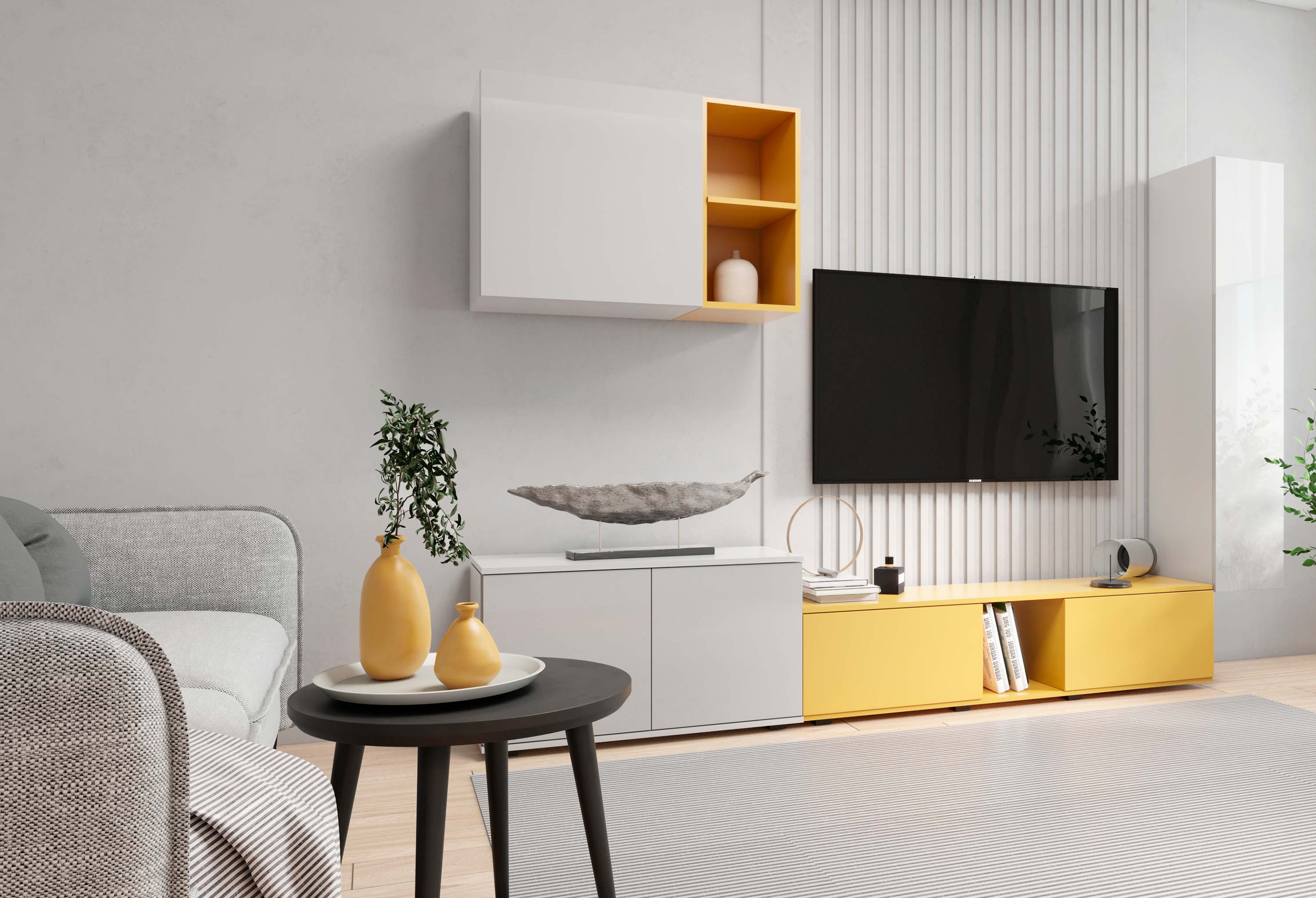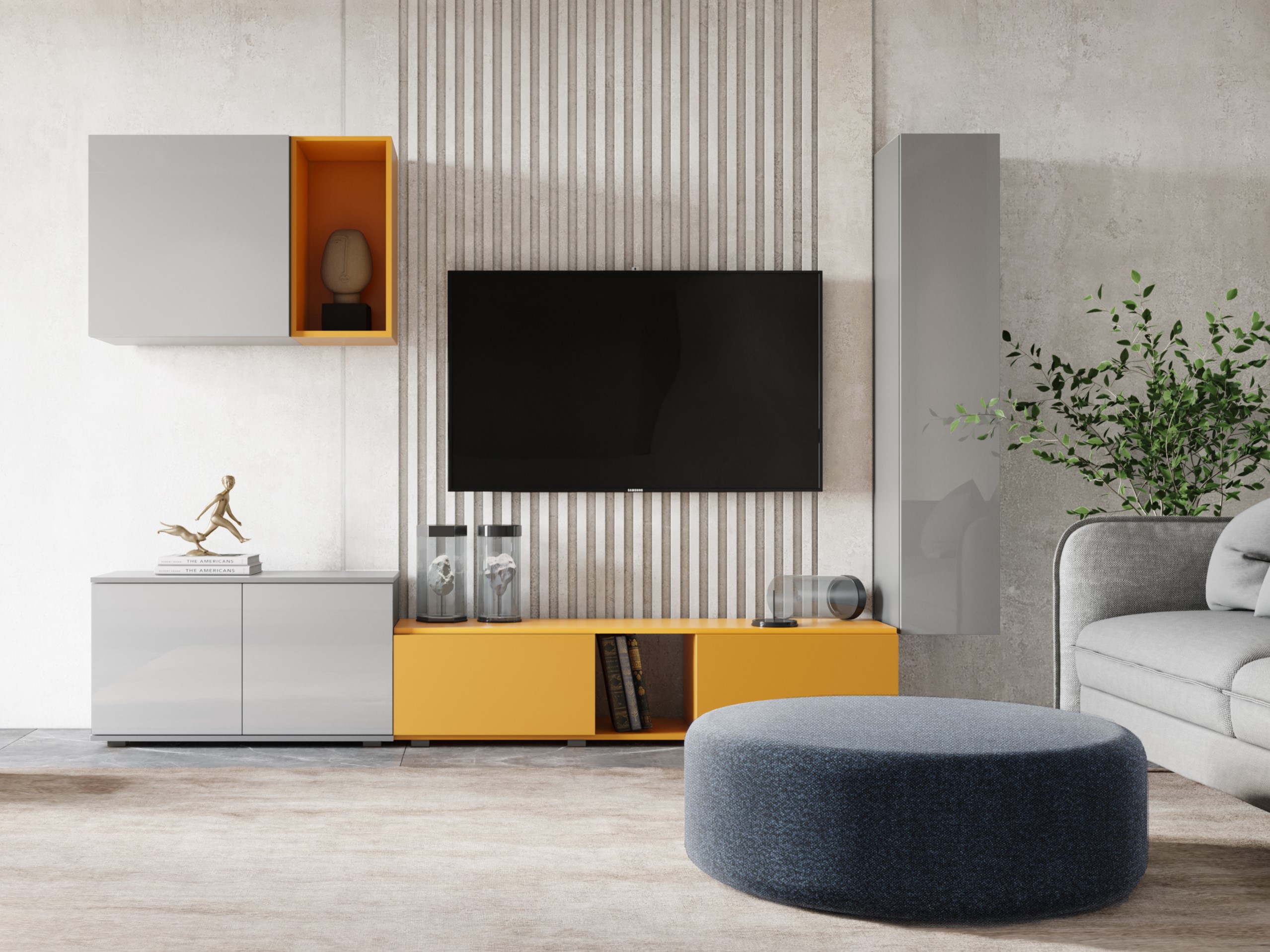 Комплект мебели для гостиной включает подвесную тумбу для ТВ с двумя откидными фасадами и топом.
