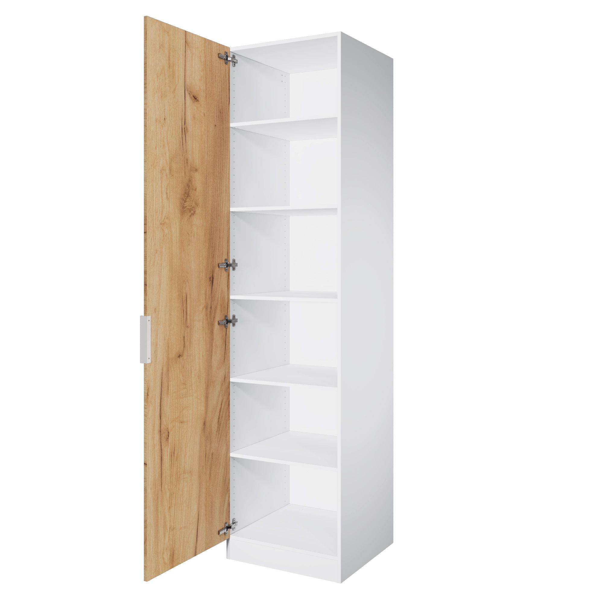 Корпус шкафа выполнен в цвете "Белый перламутр" - чистый оттенок белого. Легко сочетается с любыми декорами. Дверь шкафа выполнена в цвете "Дуб золотой" - фактурный декор с цветом и природным рисунком светлого дуба.