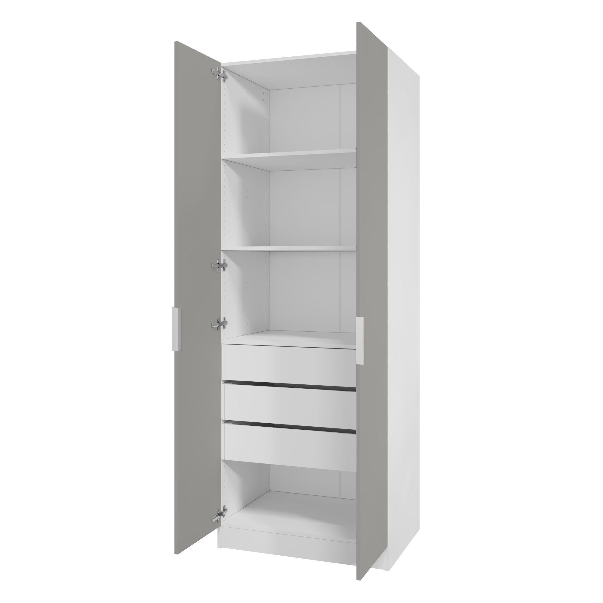 Корпус шкафа выполнен в цвете "Белый перламутр" - чистый оттенок белого. Легко сочетается с любыми декорами. Двери шкафа выполнены в цвете "Шиншилла серая" - легкий, нейтральный серый декор.