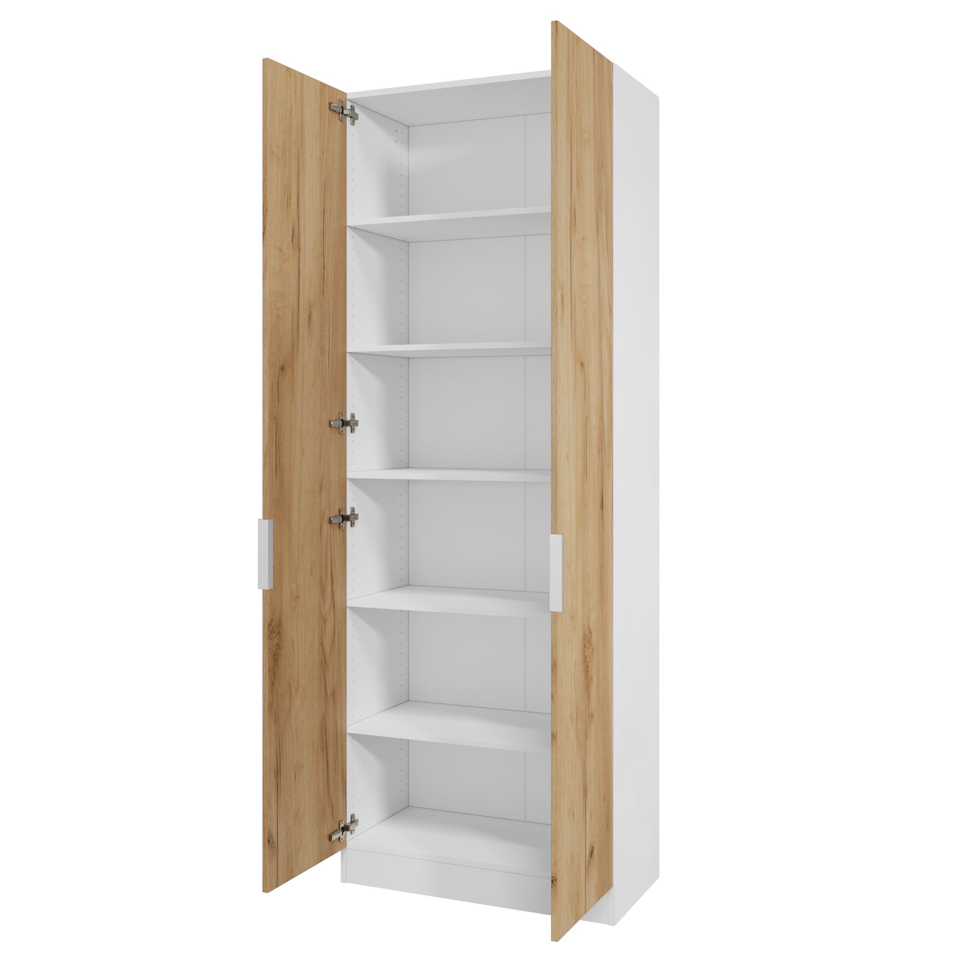 Корпус шкафа выполнен в цвете "Белый перламутр" - чистый оттенок белого. Легко сочетается с любыми декорами. Двери шкафа выполнены в цвете "Дуб золотой" - фактурный декор с цветом и природным рисунком светлого дуба.