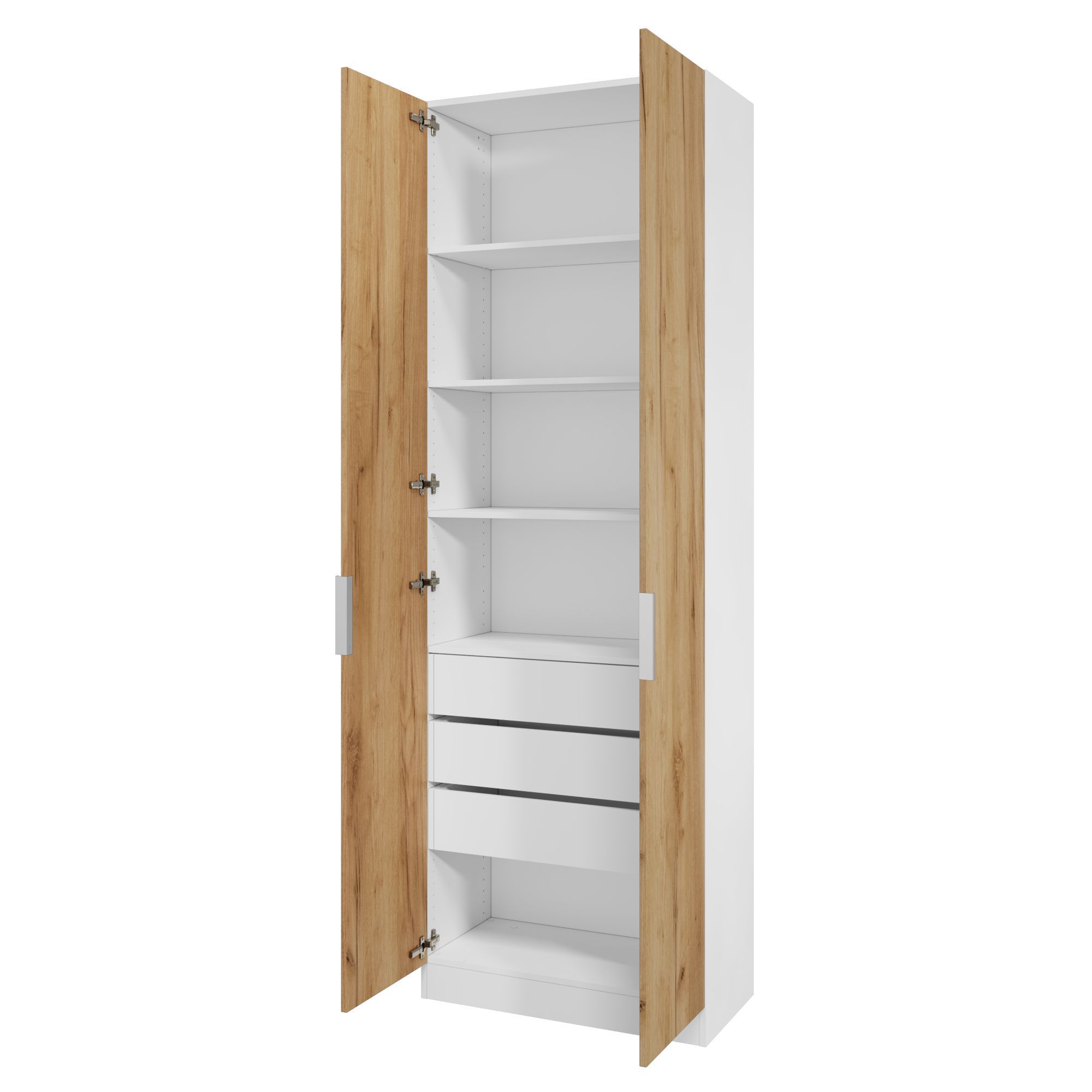 В комплект шкафа включены крепеж для сборки, петли для навешивания распашной двери, ручка, функциональное наполнение.