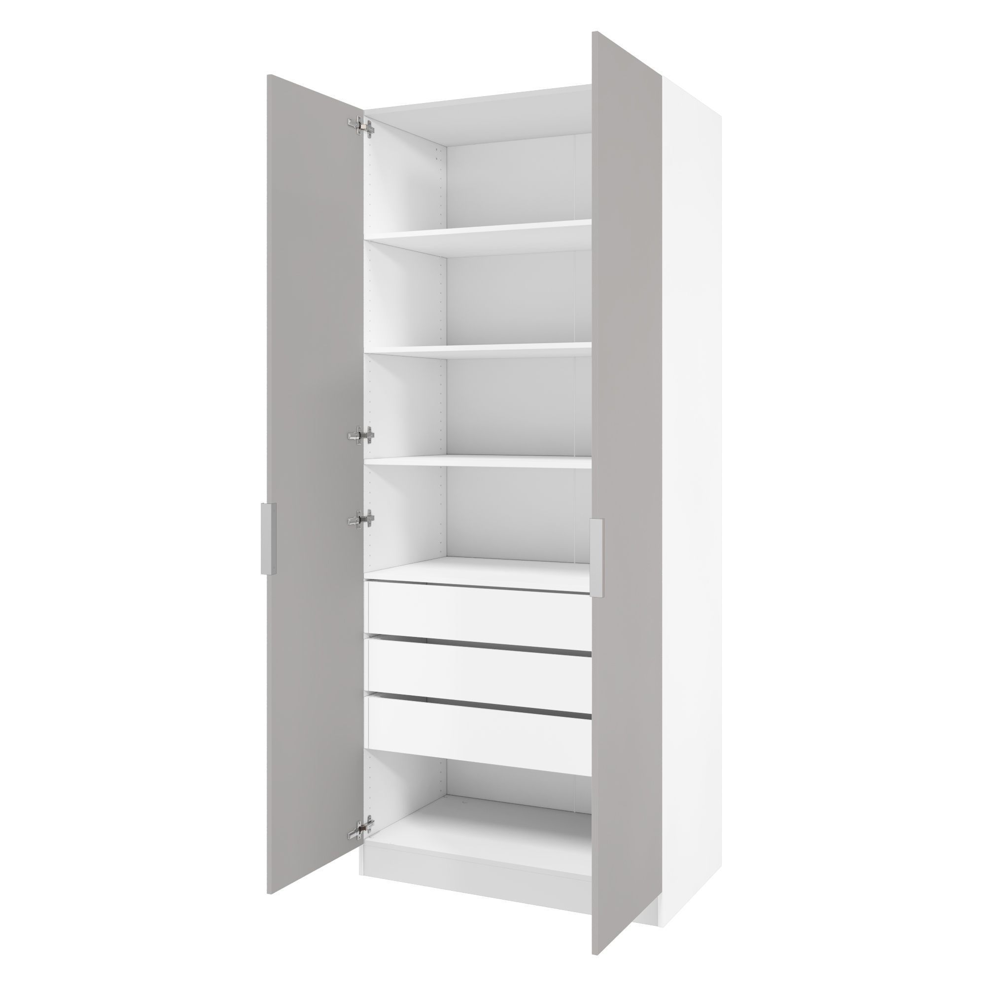 Корпус шкафа выполнен в цвете "Белый перламутр" - чистый оттенок белого. Легко сочетается с любыми декорами. Двери шкафа выполнены в цвете "Шиншилла серая" - легкий, нейтральный серый декор.