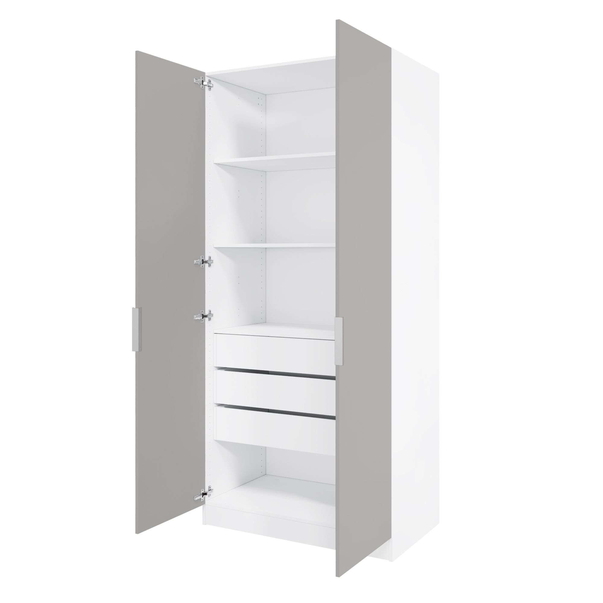 Корпус шкафа выполнен в цвете "Белый перламутр" - чистый оттенок белого. Легко сочетается с любыми декорами. Двери шкафа выполнены в цвете "Шиншилла серая" - легкий, нейтральный серый декор.