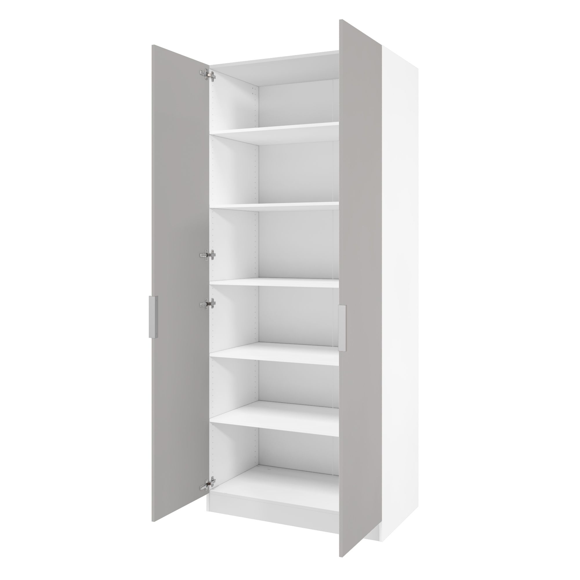 Корпус шкафа выполнен в цвете "Белый перламутр" - чистый оттенок белого. Легко сочетается с любыми декорами. Двери шкафа выполнены в цвете "Шиншилла серая" - легкий, нейтральный серый декор.