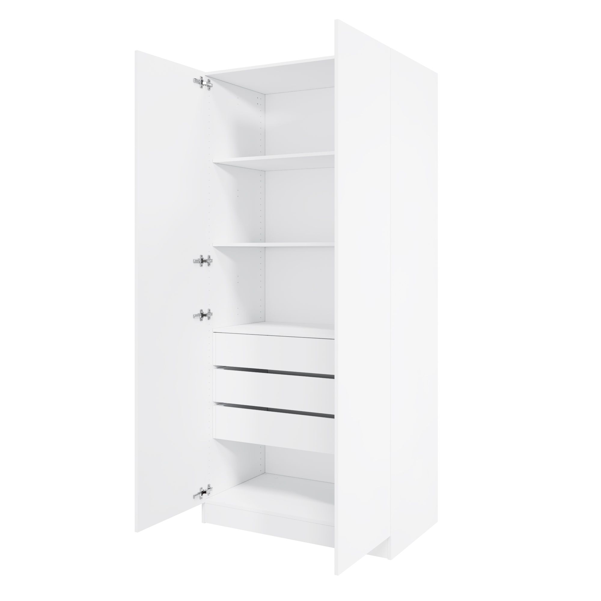 В комплект корпуса включен крепеж для сборки. Не включены: петли для навешивания распашных дверей, фурнитура для складной/раздвижной системы, ручки, функциональное наполнение - продаются отдельно.